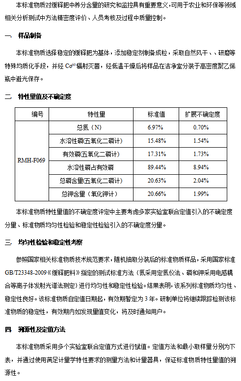 产品介绍 编号 | 特性量 | 标准值 | 扩展不确定度 | RMH-F069 | 总氮(N) | 6.97% | 0.70% | 水溶性磷(五氧化二磷计) | 15.48% | 1.54% | 有效磷(五氧化二磷计) | 17.31% | 1.73% | 水溶性磷占有效磷 | 89.44% | 8.94% | 总磷含量(五氧化二磷计) | 20.63% | 2.04% | 总钾含量(氧化钾计) | 20.66% | 1.99% |