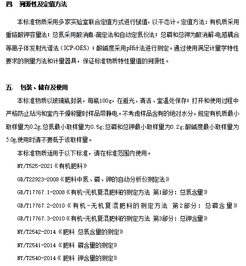 产品介绍 编号 | 物质名称 | 标准值 | 扩展不确定度(K=2) | RMH-F086 | 有机质 | 32.5% | 0.33% | 总氮 | 1.13% | 0.14% | 总磷(五氧化二磷计) | 1.28% | 0.13% | 总钾(氧化钾计) | 1.33% | 0.13% | 酸碱度 | 7.87 | 0.25 |